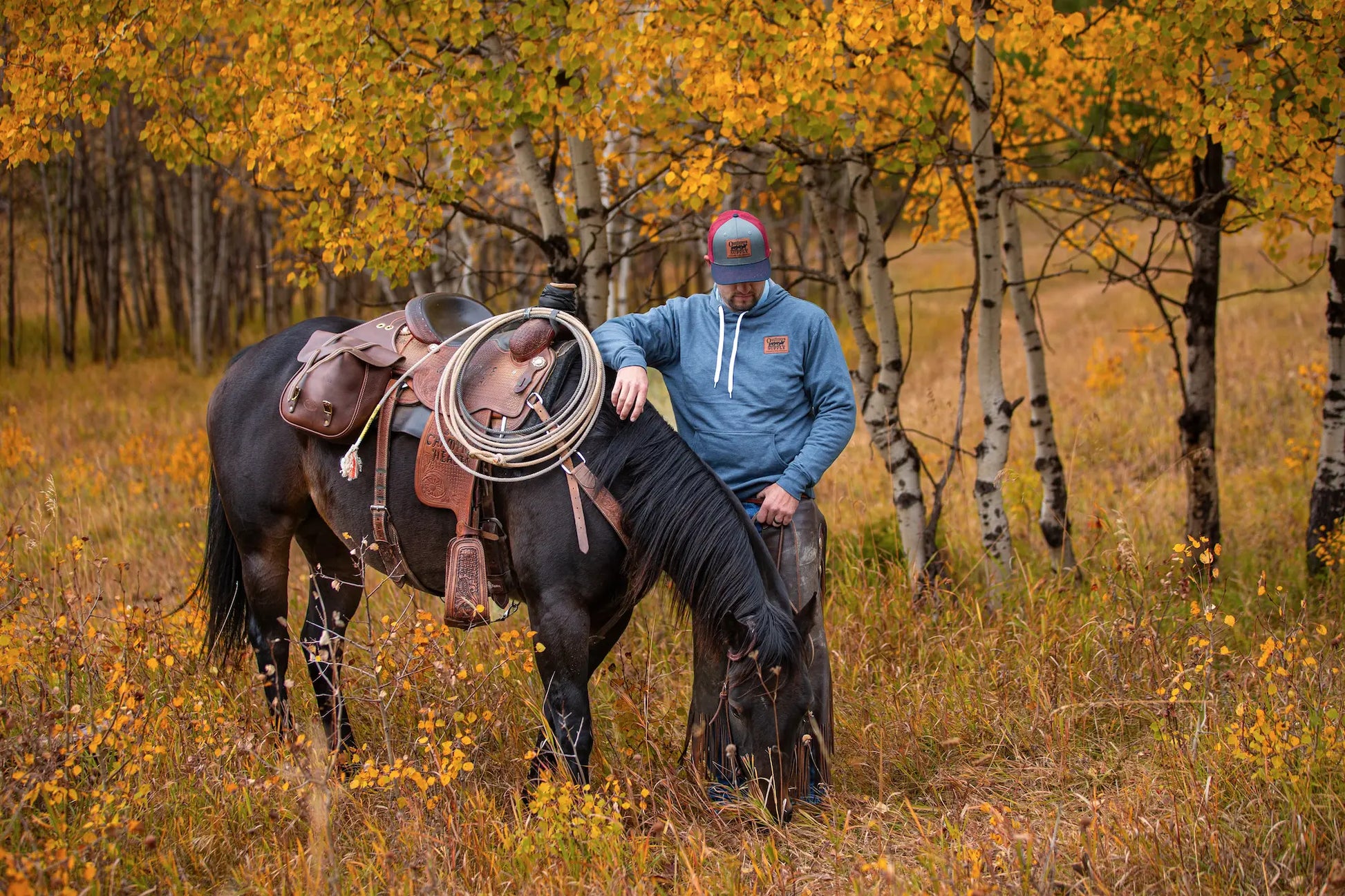 This relaxed fit, standard pullover hoodie features a tapered neck, flat shoestring drawcords and a sewn-on leather Outfitters Supply logo