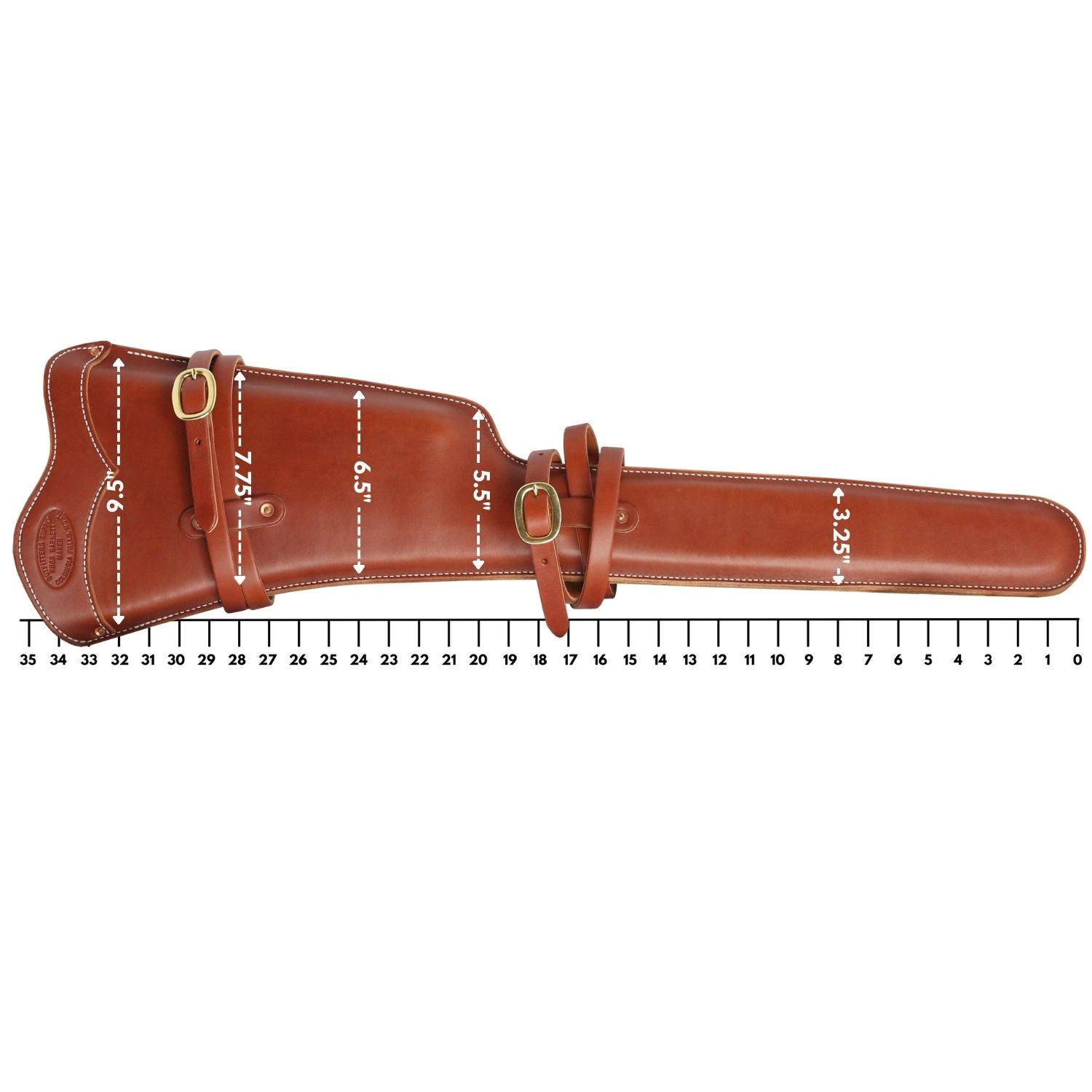 DIMENSIONS - The Yellowstone Leather Scabbard has an overall length of 34 inches and will accommodate a lever action rifle with up to a 24" barrel and 40mm scope with 1" turrets.