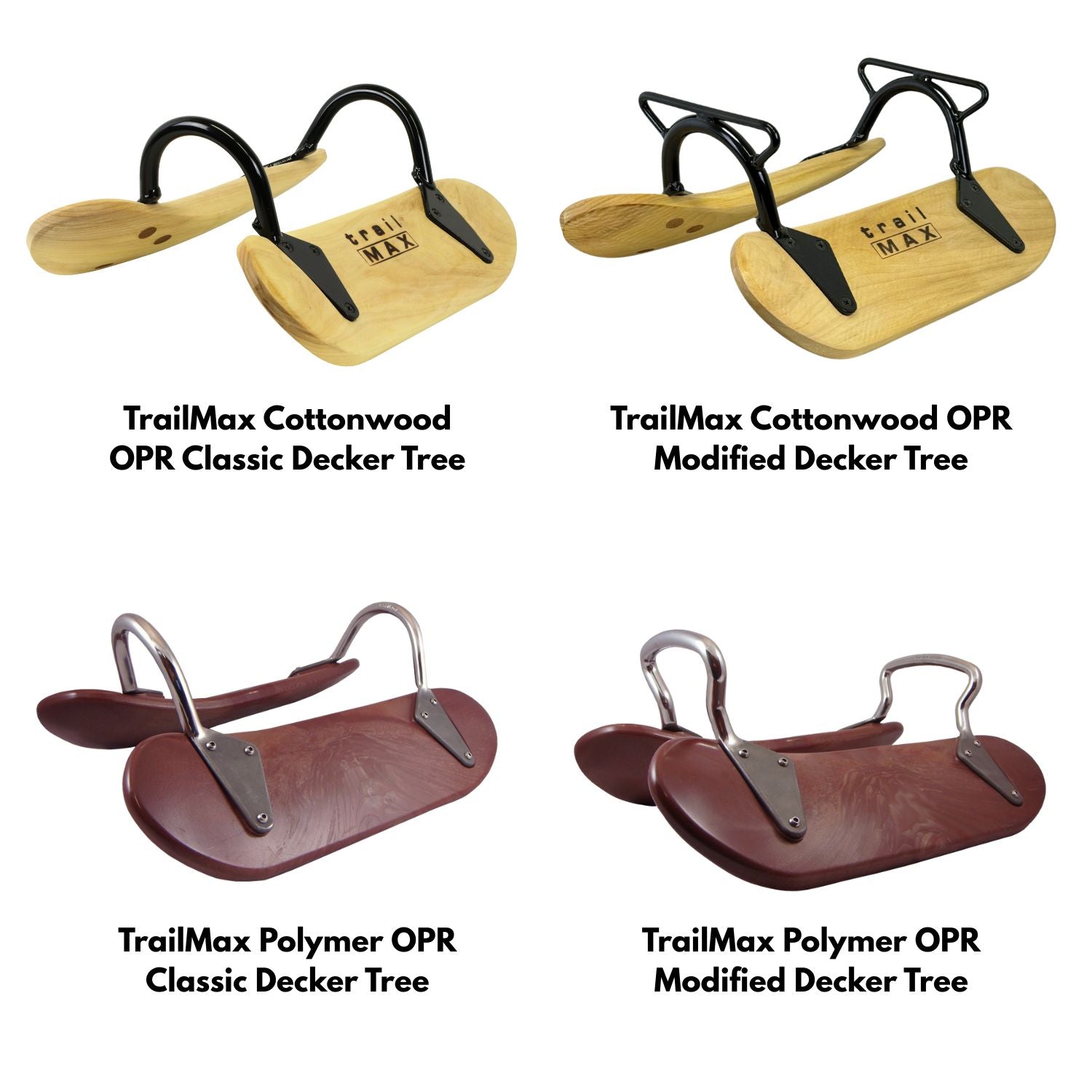 Our Decker pack saddles are available with two different types of trees: (1) our TrailMax Cottonwood Tree with solid cottonwood bars and powder-coated, cold rolled steel arches or (2) our TrailMax Polymer Tree, with polymer bars and stainless steel arches. Both types of trees are available with either classic (rounded) or modified style arches (also called hoops).